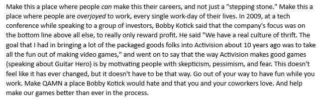 when i left in january, i asked my coworkers to do one thing: make it a place that they are overjoyed to work, and that boby kotick (who in 2009 said his goal was to take all the fun out of making games) would have hated.